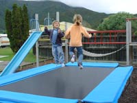 Pile pour le ferry vers l’île du sud, sans rien préparer. Trois heures de traversée sans vagues, les enfants profitent du playground, de la télé chaîne toons et des jeux d’arcade. Très économique les jeux d’arcade à leur âge, car la démonstration suffit à leur évasion, pas besoin de pièces. Le bateau passe entre des îlots, encore de sacrés marins par ici, mais on le savait déjà et nous arrivons à Picton, NZ, île du sud. Nous approchons du but. Le camping Suisse est très sympa, Christian nous donne en français le parcours idéal autour de l’île. Exactement ce que nous cherchions, à 20.000 kilomètres de l’Europe.